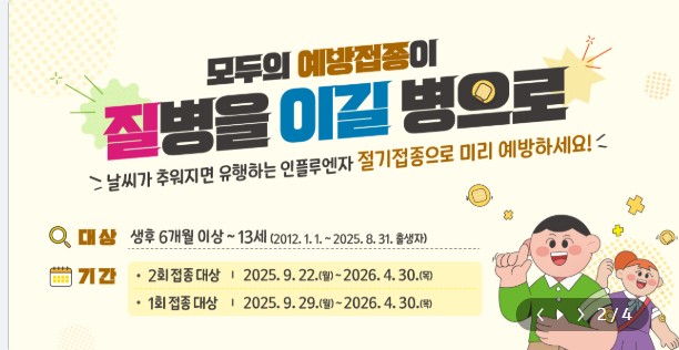 - 어린이(6개월~13세): 9월 하순부터 접종 시작, 2회 접종 대상은 9월 초부터 간격(4주) 두고 맞는 것이 좋습니다.